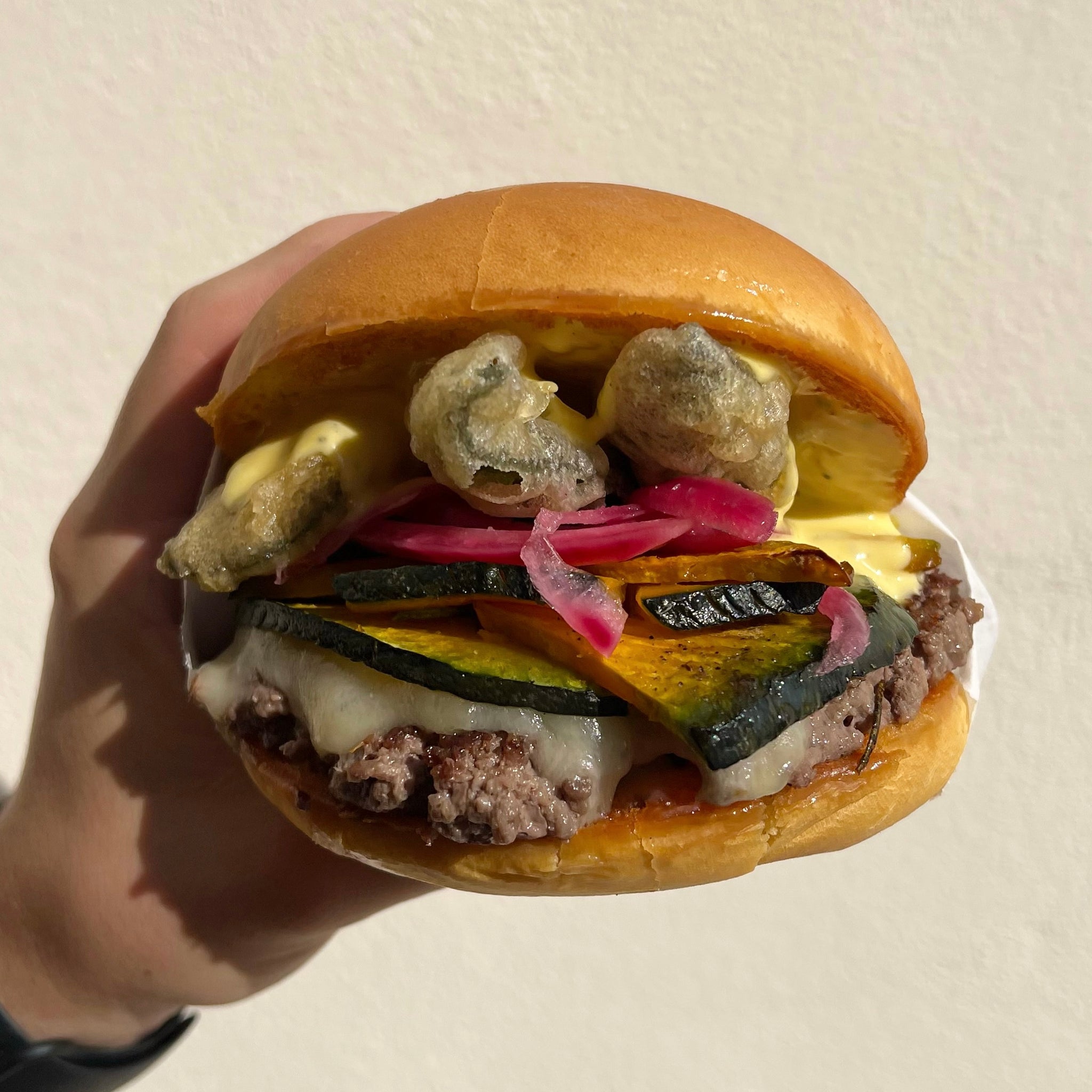 Burger di manzo, groviera, zucca al forno, cipolla pickled, salvia pastellata e fritta, salsa aioli
